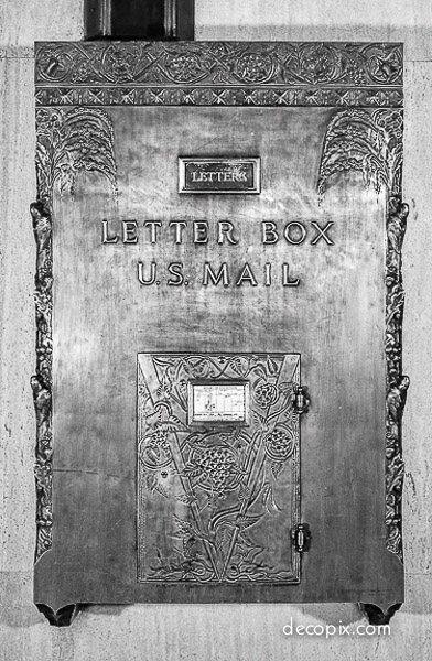 #140 West Street was notable for a lot more than just being first. For instance, due to on oddly shaped parcel of land, the base is angled in a different direction than the tower. Something that has always interested me is that perhaps because of its early date, the building seems transitional–a bit less than entirely Art Deco. Some details might be Art Deco but just as easily might not. For example, the mailbox: